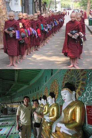 Esta ciudad y sus alrededores acogen la zona mas religiosa del país. Sus monasterios cobijan un gran numero de monjes y monjas que viven de sus donantes y desarrollan su vida de en entre rezos, ayunos y excursiones a lugares sagrados. Tambien sirve de marco al palacio real con un enorme foso en el que habitó el ultimo rey de la dinasatia Mun. Ceremonias de novicios y la vida en directo en los monasterios a la hora de la comida de mas de 1.000 monjes juntos era impactante. Por otro lado el rio refleja las costumbres de sus gentes y su otra margen guarda cosas increibles como la pagoda mas grande del mundo inacabada, la campana mas grande del mundo colgada y cerca también habia un recinto que guardaba el libro mas grande del mundo, cientos de piedras verticales a modo de hojas resguardadas cada una de ellas en una pagoda que en palí, el lenguaje sagrado estudiado por los monjes, describian la vida y enseñanzas de Buda. Niños escolarizados dentro de las pagodas jugando entre los tronos de los reyes, otros niños que ayudaban en la empresa familiar bien tejiendo las tramas de los telares o con una peligrosa rotaflex en las manos puliendo estatuas de Buda y unas puestas de sol desde sus templos envueltas en la neblina espectaculares.