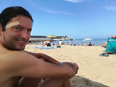 No sé qué pasa este año que se nos resiste la playa de Zumaia y nos está costando disfrutarla. Cuando estamos libres, no coincide que haga buen tiempo como para que podamos bajar para pasar un día playero mojándonos y secándonos al sol con su brisa y me preocupa que ya estemos con casi la mitad del verano transcurrida y todavía no hayamos conseguimos nuestro objetivo: pasar un día agradable bañándonos y tomando el sol. Este sábado 29 de julio las predicciones del tiempo no eran malas, asi que como teníamos tantas ganas de ir, me levanté pronto para hacer la comida, meterla en tuppers y poner rumbo a la costa. Sabíamos que íbamos a encontrarnos con la operación salida, pero tuvimos suerte porque nuestra vía de bajada estaba bastante ligera de tráfico en comparación con la de subida a Vitoria que iba a tope de coches con los maleteros rebosantes y se presentía que sus conductores llevaban muchas horas al volante, muy probablemente con destino al sur y a pasar el estrecho. Dejamos la autopista cuando llegamos al cruce de salida donde la carretera es de doble sentido y nos pegamos un buen susto porque un coche estaba adelantando a una manada de ciclistas y veíamos que se nos echaba encima, afortunadamente el abs del nuevo coche funcionó a la perfección y el otro coche pudo terminar su maniobra, pero el cuerpo se te queda temblando. En pocos metros encontramos más manadas de ciclistas, por lo que tuvimos que ir a su paso hasta llegar al aparcamiento, ya que era imposible pasarles pues la distancia que hay que respetar de metro y medio, por mucho que no venga nadie de frente, no te deja hacerlo porque circulan pegados a la línea medianera paralelos en filas de 2 o 3, en vez de ir por el arcén en fila india, y aunque tienen todo su derecho, entorpecen mucho la circulación y se juegan un accidente. Yo creo que son conscientes del peligro que corren de que un adelantamiento les pueda arrollar pero me parece que a más de uno de ellos le gusta provocar situaciones límites. No quiero extenderme porque este es un tema muy caliente en nuestra ciudad, donde ciclistas, coches y peatones no hemos llegado todavía a un mínimo acuerdo de saber cuáles son nuestros derechos y también obligaciones y el ayuntamiento tampoco ayuda a que se cumplan las normativas. En fin. El caso es que llegamos a la playa, plantamos la sombrilla y observamos que aunque la mar estaba en proceso de bajamar, las olas y la resaca eran muy fuertes. Nos paseamos por la orilla pero sin bañamos por no llenarnos el bañador de arena, así que lo dejamos para la tarde después de comer esperando amainara la tormenta submarina. Después de tomarnos una cervecita a la sombra de la sombrilla, me di cuenta de que no teníamos cubiertos, ni servilletas ni mantel y encima el pan y la fruta se habían quedado en el coche. Qué desastre. La ensalada campera estaba muy buena pero eso de coger con los fingers los canónigos mojados en vinagre francés, no era muy agradable. Las anchoas rebozadas también estaban muy buenas, pero no las comimos tan a gusto como otras veces por la falta de pan. Después de descansar tumbados un rato, volvimos a la orilla con la intención de bañarnos. Los vigilantes de la playa nos quitaron media playa para dejarla a la escuela de surf y eso nos mosqueó. Además un señor que suele nadar todos los días con sus aletas, allí estaba parado frente al agua diciendo que ese día no se metía al agua pues las olas no le iban a dejar nadar a gusto. Nosotros, como habíamos bajado para bañarnos nos metimos al agua aunque las olas encabritadas explotaban con fuerza encima de los bañistas y el agua se nos metia dentro del bañador llena de la arena suspendida que llevaba. Enseguida una ola traicionera me mojó el pelo estropeándome la coiffure de dos días antes y lo de saltar olas o bucearlas para evitar los golpes en el cuerpo al estrellarse las olas me tenía muy entretenida hasta que me di cuenta que Pedro estaba de pie en la orilla. Yo le decía que se metiera al agua pero él ahí seguía como una estatua y cuando me restregué los ojos llenos de arena para poder enfocarle mejor me di cuenta que un lado de la cara lo tenía más oscuro. A medida que iba aproximándome veía que aquella mancha le llegaba al pecho y me di cuenta que era la sangre que le salía a borbotones de una herida que se había hecho en la frente al chocar contra la cabeza de un niño al que también le había arrastrado la ola hacia la orilla. Los socorristas de la playa poco pudieron hacer más que limpiarle la herida y ponerle una tirita y como la cosa no era muy grave esperamos a secarnos y tomarnos la última cerveza fresca que nos quedaba antes de dirigirnos hacia el ambulatorio de Zumaia que, después de buscarlo y rebuscarlo bajo el solazo de la tarde, estaba cerrado y nos dirigían al de Zarautz. Con las mismas pusimos rumbo a casa y la cura se la hicieron en el ambulatorio de Olaguibel donde le atendieron rápido y de maravilla poniéndole unas sujeciones de puntos de papel en la herida. Mientras estábamos en la consulta, alguien limpió con baldes de agua el inmenso y aligerado popó que su perrito había dejado en la acera y que fueron a parar justo debajo de nuestro coche entre las dos ruedas laterales de la derecha. Qué asco. Tuvimos que llevarlo al lavadero de Trianas donde le aplicamos con fuerza chorros jabonosos a presión para borrar aquellas huellas. De vuelta a casa, y tumbados en las hamacas de la terraza norte, no nos podíamos creer la paz que por fin sentíamos tras tanta peripecia del día, que aunque no grave, fui fastidiosa y consiguió calificar este día de retorcido…. A ver si lo conseguimos a la tercera.