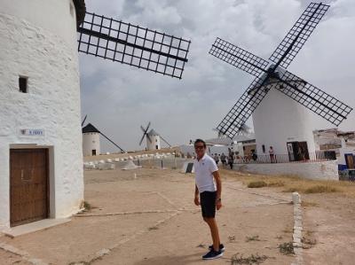 Campo de Criptana. Marco de las imágenes mas famosas de la Mancha gracias a sus molinos centenarios situados en pleno cerro que domina todo el valle. Aqui Pedro luchando contra los gigantes como hizo don Quijote en uno de los pasajes mas famosos de su novela. Por culpa de las restricione, no pudimos ver el molino del Culebro donde está el museo dedicado a Sarita Montiel asi que se nos queda pendiente. Ese mismo dia vistamos Puerto Lapice donde estaba una de las ventas en las que descansaba el personaje. El calor era tan inmenso que provocaba una neblina del polvo en suspensión muy inquietante mientars conduciamos para Ciudad Real.