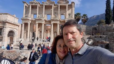 Gracias a un billete-premio de la Turkish que nos costó un triunfo canjearlo y muy expectantes porque contratábamos con una agencia local y nos quedaba esa duda de cómo de formales llegarían a ser, llegamos al inmenso aeropuerto de Estambul. Tal como nos indicaron, reconocimos el letrero de referencia enseguida y nos condujeron en una furgoneta nueva e impecable al hotel. El conductor nos hablaba tranquilamente por medio del traductor del móvil haciéndonos unas risas y relajando el ambiente. Este invento del traductor debe recibir un premio nóbel por lograr facilitar la comunicación en la torre de Babel que sufrimos en este mundo. El hotel era muy céntrico y al dia siguiente, tras desayunar con quesos y aceitunas turcas, ya estábamos en 5 minutos en el punto de reunión: la salida de la Cisterna Basilica. Durante 2 dias nos llevaron de excursión con cuatro personas más, un dia por la zona moderna y otro por la de los principales monumentos otomanos. Recordamos de las veces anteriores los palacios, monumentos y mezquitas de esta bulliciosa ciudad; paseamos de nuevo por el Bósforo y por el puerto y disfrutamos viendo a los pescadores en el puente de Galata. Tras las excursiones, una gran cerveza nos hacia descansar y reposar las vivencias del día. Acabadas las visitas a la capital, nos pusimos en ruta hacia el sur del país por la costa. Llegamos a Gallipolis, ciudad de batallas, en pleno estrecho de los Dardanelos. Bajamos hasta Troya con su caballo habitable y sus 9 ciudades una encima de la otra. Subimos en teléférico a la acrópolis de Pérgamo. Llegamos a la bonita bahía de Kusadasi y fuimos a ver la espléndida Efeso y la casa de la Virgen, lugar de peregrinación de Papas. Visitamos Pamukkale con sus deslumbrantes piscinas naturales y la ciudad a la que beneficiaban estos baños termales, Heliópolis. De aquí y con pena, volvimos en avión a Estambul, donde tuvimos todo un dia libre más para seguir admirando los tesoros del museo arqueológico, la Cisterna por dentro, comernos un bocadillo de pescado junto a las lanchas del puerto y cenar en el Otantik, un restaurante muy romántico. Muy agradecidos al buen trato de la agencia local, a sus excelentes guías y a Basaq, nuestra contacto en todo momento, volvimos a casa en un dia soleado de otoño.